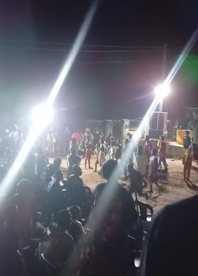 The video depicts a nighttime outdoor gathering of many people. They are silhouetted against bright lights illuminating a makeshift stage area. Some individuals are standing and dancing near the stage, while others are seated. The environment appears to be a village or rural setting. There are simple structures or buildings visible in the background, and an audio recording captures music and what appears to be public address announcements.