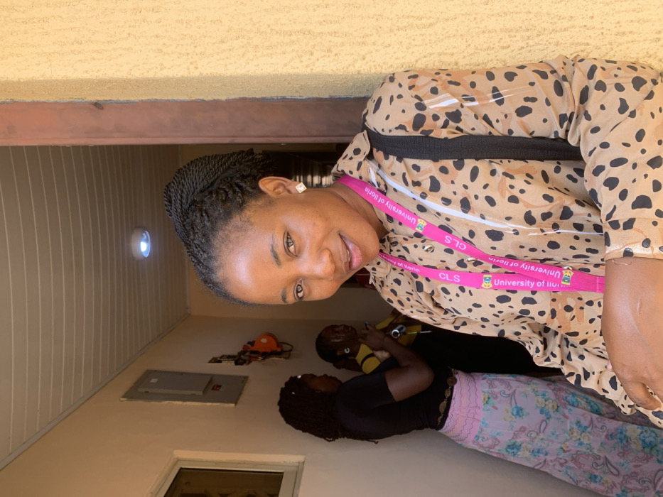 The image depicts three adult females within what appears to be an indoor or covered entryway in Apata Yakuba, Ilorin, Nigeria. The primary subject, an adult female with braided dark hair and light brown eyes, is positioned in the foreground, smiling and looking directly at the camera. She wears a tan and black leopard-print long-sleeve shirt, square stud earrings, and a pink lanyard displaying "CLS" and "University of Ilorin." A black strap is visible over her right shoulder. She stands at a threshold, with a dark brown door frame to her right. The exterior wall to her right is yellow and textured. In the background, two additional adult females are visible. One, on the left, wears a black top and a pink and blue patterned long skirt. The other, centrally located in the background, wears a yellow top and holds a small, dark object. Both are interacting with each other. The interior walls are cream-colored, with a white paneled ceiling featuring a circular LED light fixture. A white-framed window is visible on the left, and an electrical service panel is mounted high on the wall, below which an orange item hangs from a hook. The scene is brightly illuminated.