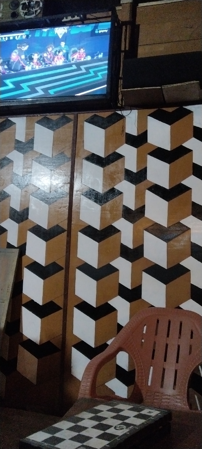 This image, taken in Desa Meunasah Blang, Indonesia, depicts an indoor or semi-enclosed recreational area. A large, wall-mounted television screen dominates the upper portion, displaying what appears to be an esports event or competitive gaming session. The screen shows a group of approximately six to eight individuals, dressed in similar red and black uniforms, seated behind a long table, focusing on unseen screens or equipment. A "gopay" logo is visible in the upper right corner of the TV display. Below the television, the wall is adorned with a repetitive optical illusion pattern composed of black, white, and light brown cubes, creating a three-dimensional effect across multiple vertical panels. In the lower right foreground, a single, unoccupied, light brown plastic chair with a slatted back and armrests is positioned. In front of the chair, an empty chessboard, featuring standard black and white squares, rests on a dark, flat surface, likely a table. No chess pieces are present on the board. The overall lighting suggests an interior setting, possibly at night or in a dimly lit space.