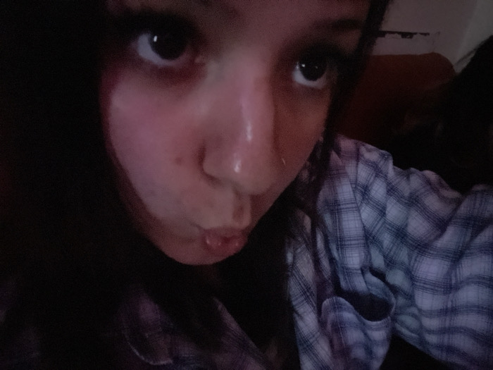 This image depicts a close-up portrait of an individual, with the scene identified as being located in Stara Zagora, Bulgaria. The subject, visible from the upper chest upwards, presents with dark hair and a direct gaze upwards and slightly to the viewer's right. The face exhibits a prominent nose, detailed by a small, metallic stud or ring piercing the right nostril. The lips are actively pursed into a pouting configuration. A small, circular, dark mark is discernible on the right cheek, inferior to the right eye. The individual is attired in a light-colored plaid shirt, patterned with blue and white checks. The environment is dimly lit, with a soft light source illuminating the front of the subject, imparting a reddish cast to the skin. The background is uniformly dark and out of focus, with an indistinct, dark reddish-brown shape faintly present in the upper right, indicative of an interior setting.