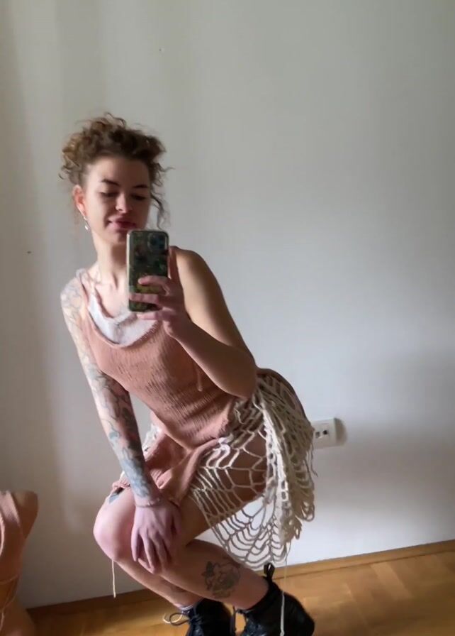 A woman with curly brown hair tied in a bun and multiple tattoos on her arms and legs is taking a mirror selfie in an apartment. She is wearing a sleeveless pink dress with a white underlayer, a fringe-like white crochet wrap around the bottom, and black boots. She is holding a phone with a camo-patterned case to take the photo. Behind her is a white wall with an electrical outlet and a wooden floor. To her left, a partial view of a mannequin torso wearing similar clothing is visible. The lighting is bright, and the focus is on the woman and her attire. She stands up from a squatting position, turns briefly, and moves her arms to show off the dress.
