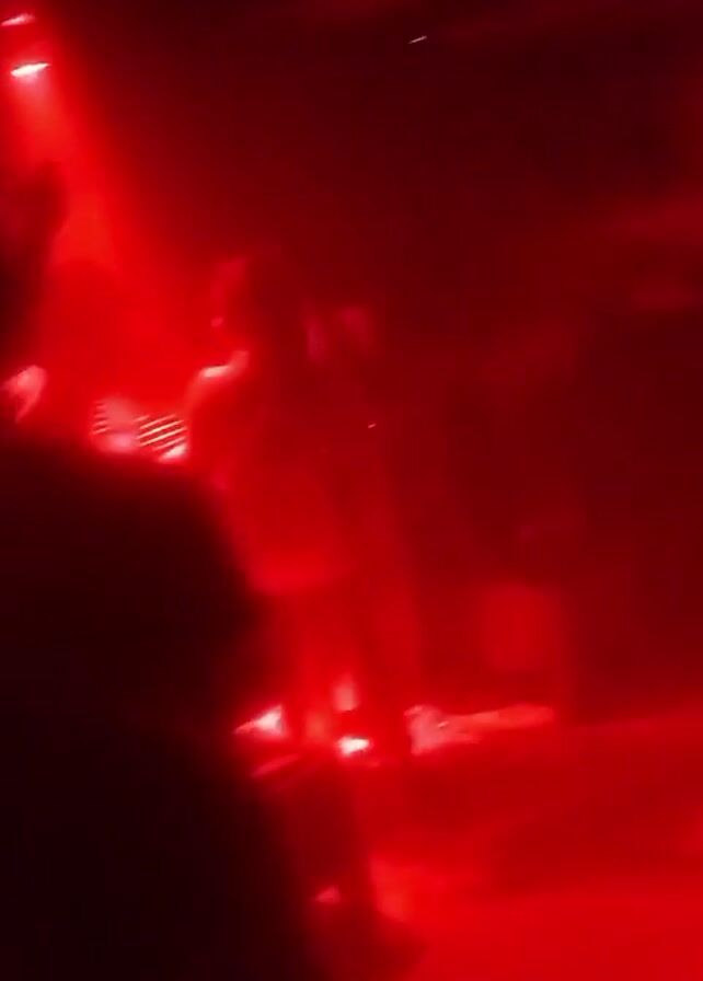 dimly lit, crowded room bathed in red light. The people are mostly silhouetted and dancing. Some small tables are visible along the wall.