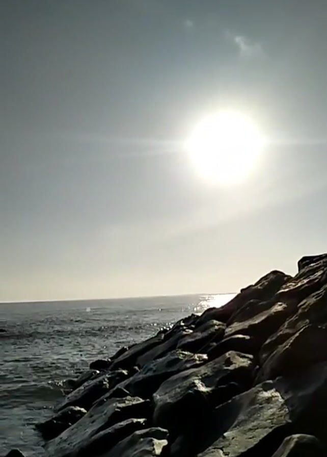 The video begins with a shot of a rocky shoreline and a bright sun in a hazy sky over the ocean
