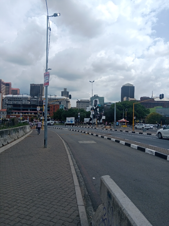 The image depicts an urban street scene in Newtown, Johannesburg, South Africa, specifically at the intersection near the Firewalker sculpture