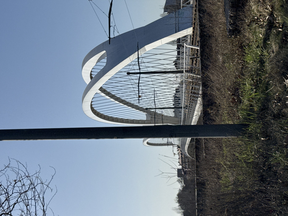 The image depicts the Pont Beatus Rhenanus bridge in Kehl, Germany, under a clear blue sky. The central subject is a modern, white tied-arch bridge, characterized by two prominent, curving arches and a dense grid of vertical suspension cables supporting its deck. Railway tracks are visible across the bridge, equipped with an overhead catenary system supported by several dark, slender utility poles with horizontal cross-members. In the immediate foreground, a dark, vertically oriented utility pole stands to the left of the frame's center, partially obscuring the bridge structure. The foreground consists of dry, brown, and some green overgrown vegetation on an earthen or concrete embankment. Bare tree branches are visible in the upper left corner of the frame. Distant urban buildings and faint industrial structures are discernible on the horizon in the background. No individuals, vehicles, or dynamic actions are present in the scene.
