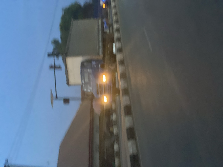 A nighttime view of a street with a dark blue truck parked near the curb. Its headlights are on. A building is adjacent to the truck, with a utility pole nearby. The road is dark grey, and the sky is a hazy blue. A black and white striped curb separates the road from the adjacent structures. The overall image has a slight blur.