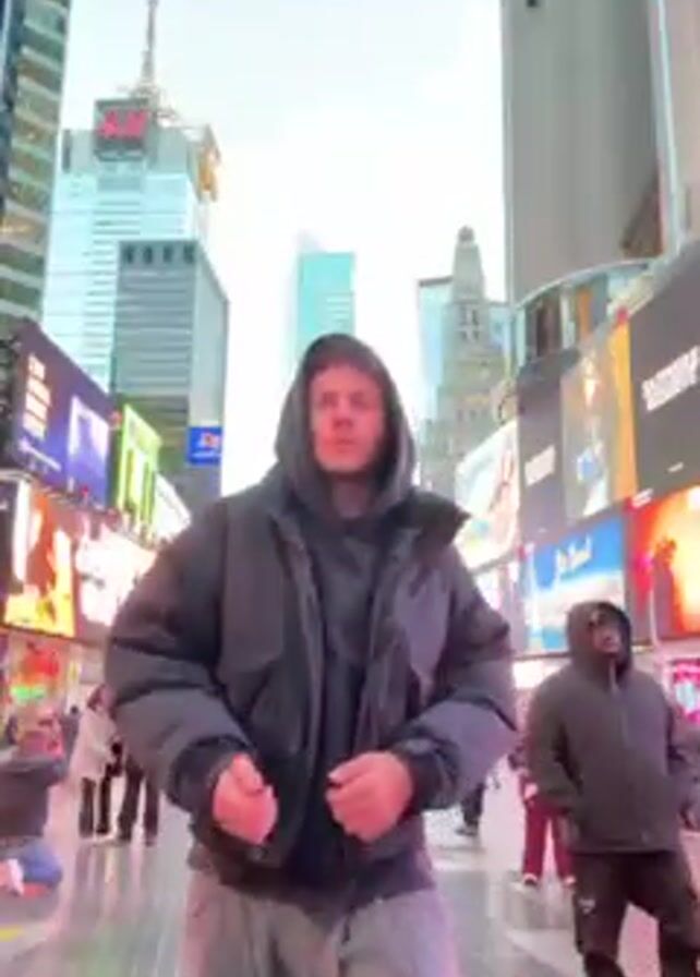 A man stands in Times Square, New York City, amidst a crowd and towering buildings with bright digital billboards. He is wearing a black puffer jacket over a hooded sweatshirt and grey pants. The hood of the sweatshirt is up, framing his face. He is facing the camera and making hand gestures. The sky is partly cloudy, and daylight illuminates the scene. Other people are visible in the background, walking and observing the surroundings.