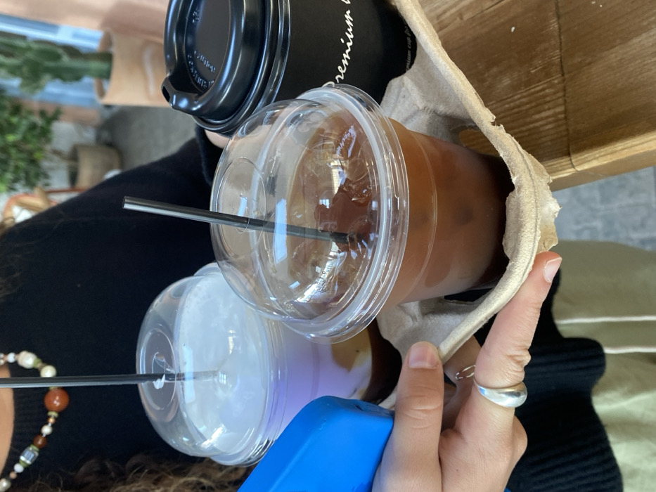 In Skala, Greece, a close-up image depicts a person holding a light brown, molded fiber cup carrier containing three beverages. The individual's hands are visible, wearing a plain silver-toned ring on the left ring finger and holding a partial blue object, likely a smartphone, with the left hand. The person is dressed in a black long-sleeved garment and light-colored lower garments, with a multi-bead necklace visible around the neck. The drinks include: one clear plastic cup with a dome lid and black straw containing a layered light purple and brown iced beverage; one clear plastic cup with a dome lid and black straw holding a dark amber iced beverage with ice cubes; and one black paper cup with a black plastic lid, partially showing "Premium" text. The background is blurred, revealing a light-colored wooden surface in the foreground and potted plants, including a cactus, in terracotta-colored pots in the distance.