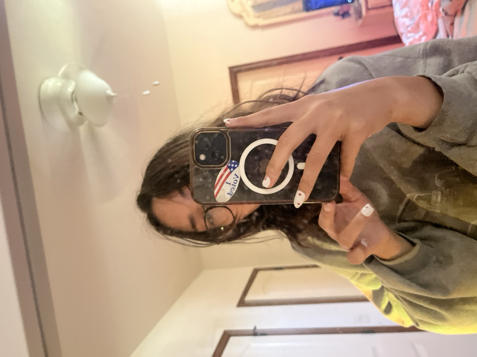 A female individual is depicted in a mirror selfie taken within a residential interior in Choctaw, United States. The subject has long, dark hair, wears eyeglasses, and is dressed in a grey long-sleeved garment. Her right hand, visible in the reflection, holds a dark-cased smartphone featuring a white circular MagSafe ring. An "I VOTED" sticker, displaying an American flag motif, is affixed to the phone case, appearing reversed due to the mirror. The nails on the visible hand are painted white with small red heart decals. A lighter skin patch is present on the visible forearm. The reflective background includes light-colored walls, a white ceiling with a stationary white ceiling fan/light fixture, and two interior doors. A decorative mirror frame and a source of blue/pink illumination, possibly from an electronic device, are partially visible on the right, adjacent to patterned fabric suggesting bedding.