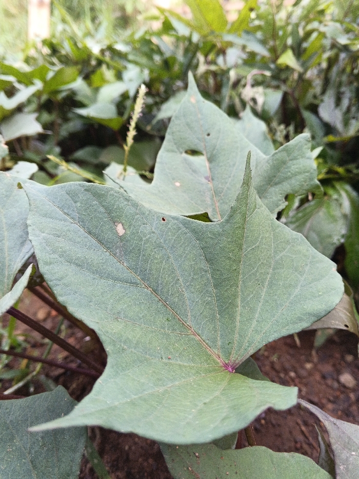 - "Close-up of green sweet potato leaves with red veins, prominently featuring one large leaf with a pointed tip and visible veins" by FM-rcgQY2, licensed under CC BY 4.0