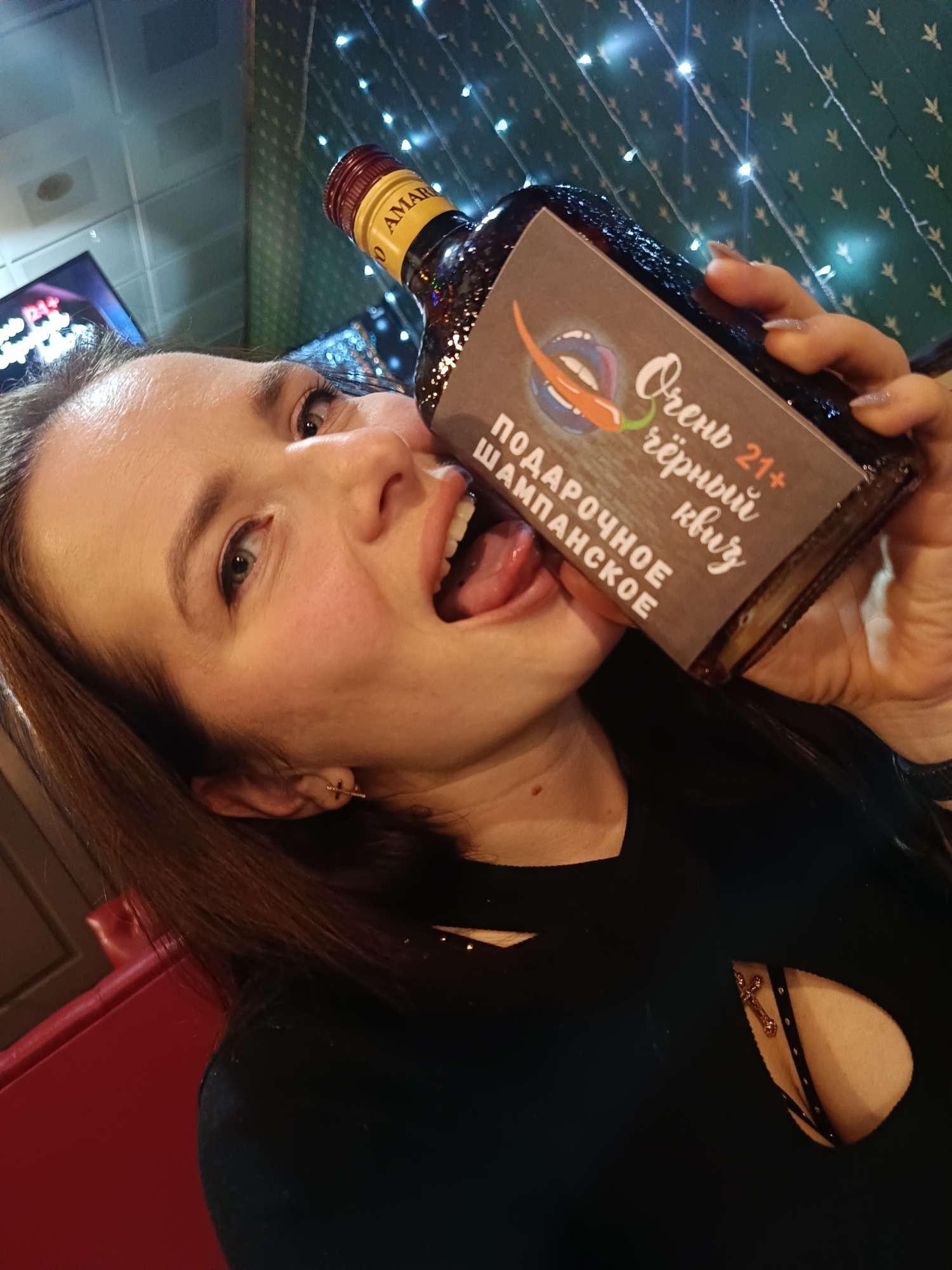 A woman poses with a bottle of "Amaro" liqueur in what appears to be an indoor setting. The label on the bottle says "Очень 21+ чёрный киви ПОДАРОЧНОЕ ШАМПАНСКОЕ". The woman is fair-skinned with brown hair and is wearing a black top. The background shows a wall with lights, and there is a red booth seat partially visible. A TV monitor can be seen in the upper left corner. This image was likely taken in Chaikovsky, Russia, based on the language on the bottle.