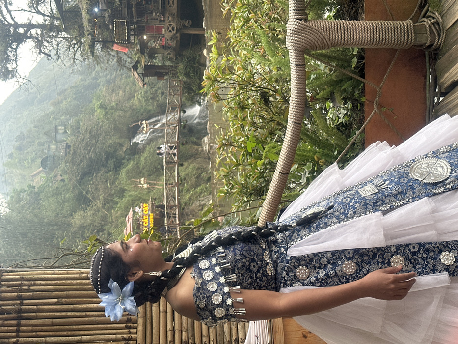 An outdoor scene in Cát Cát village, Hoàng Liên mountains, Vietnam, features a female individual in traditional attire facing right, positioned on an elevated wooden platform
