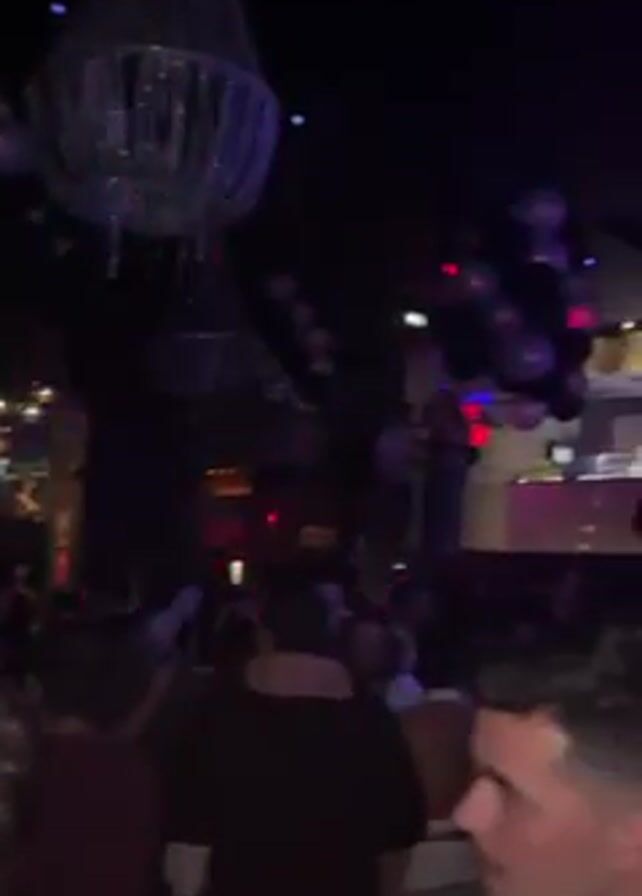 dimly lit, crowded nightclub. Many people are standing and moving around. There are chandeliers hanging from the ceiling and balloons floating above the crowd. The lighting changes, with flashes of green, red, and blue. A DJ booth is visible in the background, elevated above the crowd. People appear to be talking and socializing.
