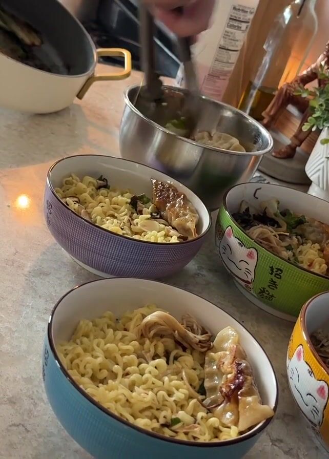 A person is preparing ramen bowls in a kitchen