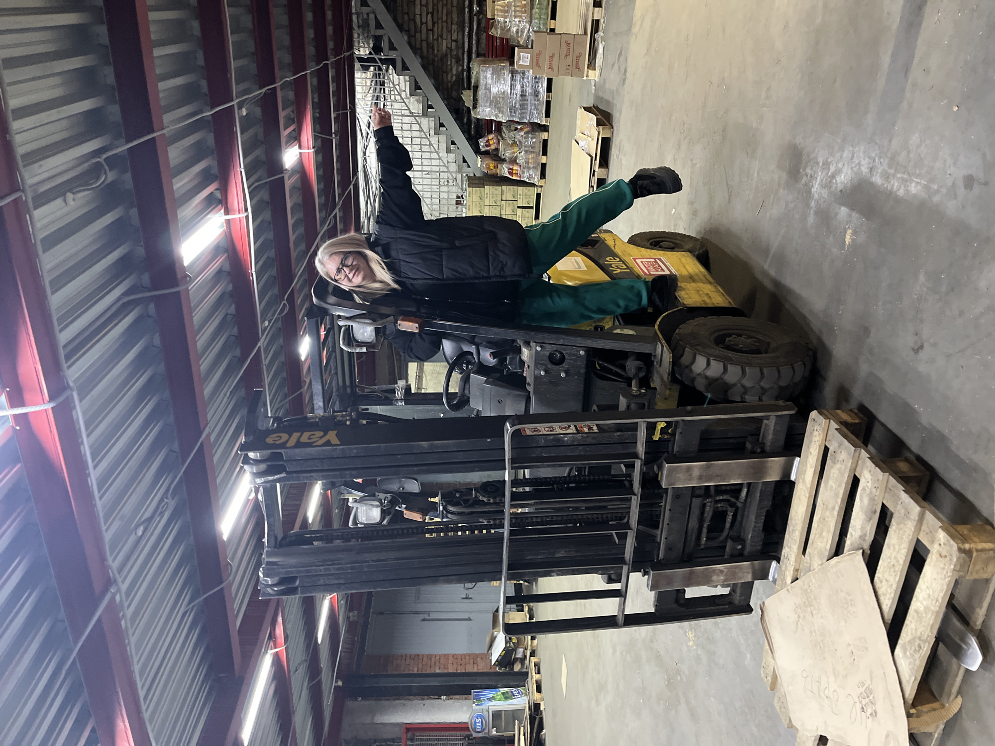 An indoor warehouse facility, identified as belonging to the Magnit retail chain, is depicted in Izhevsk, Russia. The environment features a grey concrete floor, a ceiling with exposed red metal beams and corrugated metal roofing, and multiple fluorescent light fixtures. A single female subject with blonde hair and eyeglasses is positioned on the left side of a yellow Yale forklift. She wears a black puffer vest, a black long-sleeved shirt, green sweatpants with a white stripe, and black platform-sole shoes. Her left foot is placed on the forklift's side step, and her left hand grips a vertical component of the forklift's mast. Her right leg is bent and elevated outwards, with her right foot not contacting the ground. Her right arm is extended horizontally to her side, pointing towards the right. She is smiling and looking directly at the camera. The forklift, a Yale brand model, has a yellow body and black mast assembly. A red and white sticker reading "МАГНИТ КАРИ" (Magnit Kari) is affixed to its side. In front of the forklift's lowered forks are two stacked wooden pallets; a light-colored sheet of paper with handwritten marks rests on the upper pallet. The background displays elements consistent with a storage or distribution center. To the left, an illuminated 'Efes' beer display stand is visible near a grey wall with exposed red brick and a red metal frame. A large grey double door is present further back. Towards the right, multiple pallets are stacked with various packaged goods, some labeled 'МАГНИТ' (Magnit) and secured with plastic wrap. A metal staircase ascends in the far right background.