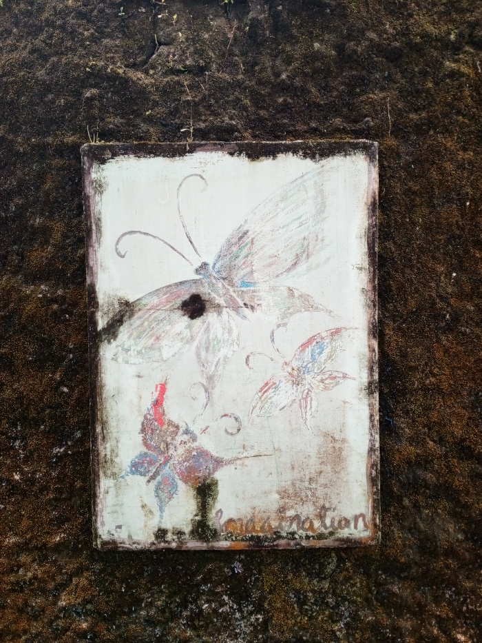 A rectangular, weathered artwork is affixed centrally to a dark, moss-covered stone wall in Voa Yeav, Cambodia. The artwork features a light-colored, possibly off-white, background with faded, stylized imagery. A large butterfly with faint white, blue, and pink hues and a dark central spot dominates the upper-middle section. A smaller butterfly, also with multi-colored wings, is positioned to its right. A stylized element, possibly a flower or bird, with red, blue, and brown tones, is visible in the lower-left portion. Faint, smudged cursive script, possibly reading "lumination," is discernible along the bottom edge of the artwork. The artwork itself shows signs of discoloration and wear, with darker borders and mottled surface textures. The surrounding wall is densely covered in dark green and brown moss and lichen, with small green plant sprouts emerging from crevices, particularly in the upper sections. No individuals, actions, or direct interactions are depicted.