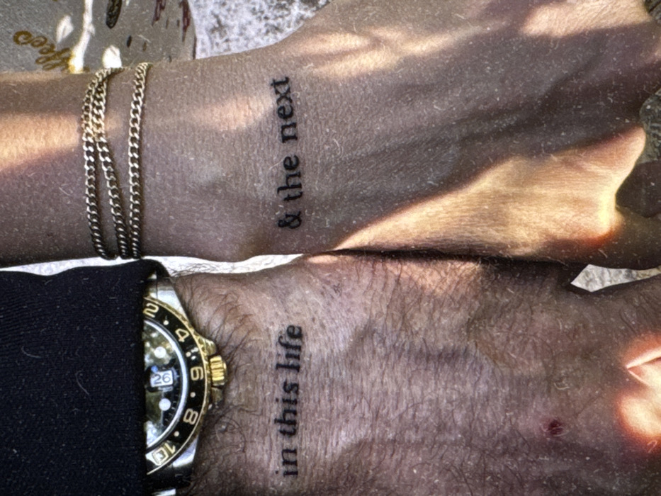 Two hands, each with a tattoo, are juxtaposed. The top hand features two gold chain bracelets and a tattoo that reads "& the next." The bottom hand has a luxury wristwatch and a tattoo that says "in this life." Both hands are light-skinned and show visible hair. Lighting creates shadows across the hands and wrists.
