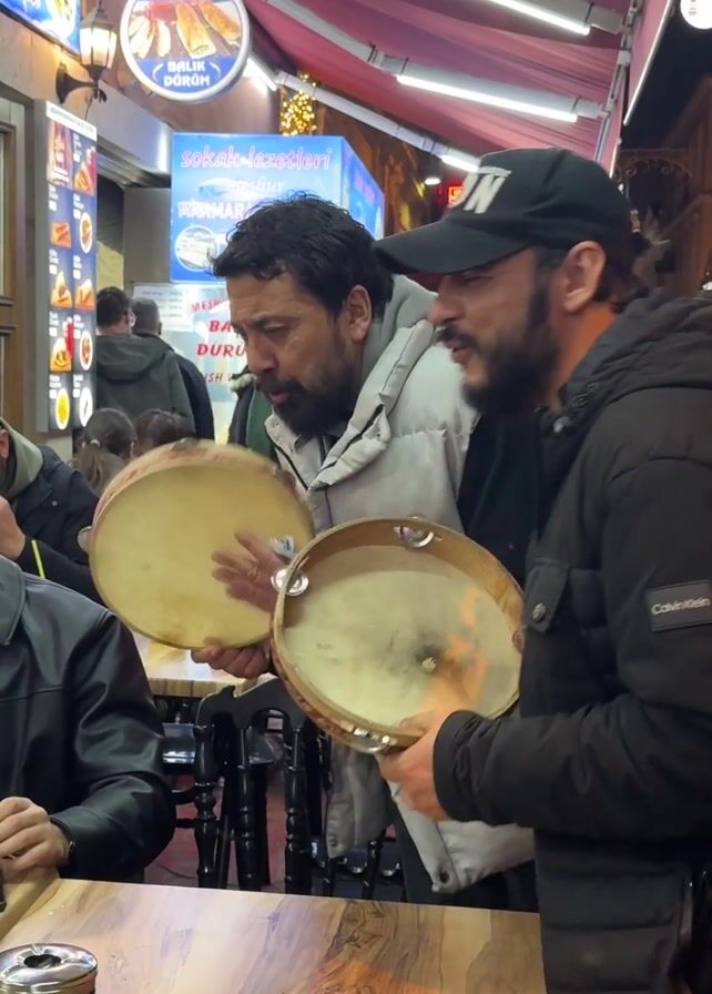 Two men are playing tambourines outside of a restaurant with outdoor seating. The man on the left is wearing a beige puffer vest and is more animated as he plays, opening his mouth wide as he sings. The man on the right is wearing a black puffer jacket and a black baseball cap with white writing. He smiles as he plays along with the other man. A man sits at the table closest to the camera, looking down at his phone. There is an ashtray on the table. There are other people inside the restaurant and walking in the background. A street sign advertises "BALIK DURUM" and "MEŞHUR MARMARA BALIKÇISI" and "FISH WRAP". The restaurant is illuminated with string lights and various light fixtures.
