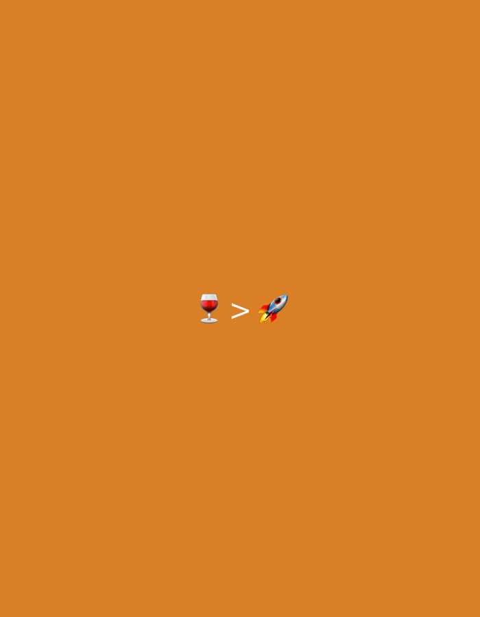 digital graphic of a wine glass emoji, followed by a "greater than" symbol, followed by a rocket emoji. The emojis are centrally located on a solid orange background. The location is not provided in the image.