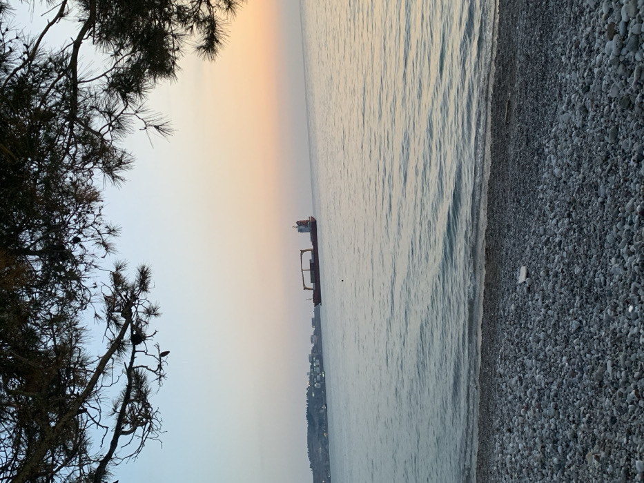 This image depicts a coastal scene at dusk in Bar, Montenegro. The foreground features a grey pebble beach, with small, rounded stones dominating the bottom quarter of the frame. A white, irregular object and a dark, slender stick are visible on the pebbles near the waterline. The midground consists of a calm sea with gentle ripples, reflecting the soft light. A red-hulled cargo ship, equipped with multiple cranes and visible cargo containers, is positioned on the water, slightly left of the center. In the distant background, a landmass with hills and scattered buildings, consistent with a coastal town, is discernible along the horizon. The sky exhibits a gradient, transitioning from light blue at the top to warm orange and pink hues near the horizon. Overhanging pine branches, with dark needles and visible pinecones, frame the top portion of the image, obscuring part of the sky.