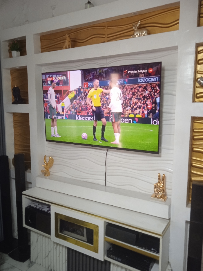 This image depicts an indoor living space, identified as being in Lagos, Nigeria, showcasing a modern entertainment unit. A large, flat-screen television is centrally mounted, displaying a live Premier League football (soccer) match between "NFO" and "CHE," with the score 0-2 and the time at 79:59. Three players and one referee are visible on the green pitch, along with a football. The referee, wearing a yellow shirt and black shorts, interacts with a player in a white jersey with the number 24. A player in a white jersey stands to the left. Spectators fill the stadium in the background. The television is integrated into a white, multi-tiered media console unit with gold accents. The wall directly behind the TV features a textured, wavy white panel design. Below the TV, a white shelf extends, upon which a golden eagle figurine is placed on the left, and a golden "peace sign" hand figurine is on the right. The console unit itself is white with gold trim, featuring several open and closed compartments. A black audio component is visible in an open compartment on the far left. A central compartment, framed in gold, appears to house a decorative feature or another media component. Further to the right, another black audio component is housed within an open shelf. Below the console, the wall features vertical grey and white striped panels. To the left of the main unit, a tall, slender black speaker stands vertically. A similar speaker is partially visible on the far right. The overall wall structure incorporates additional shelving units: to the upper left, a small green potted plant in a white pot rests on a shelf, and a dark sculpture is positioned in a niche below it. Above the TV, a golden deer figurine and another small golden animal figurine are placed on an elevated shelf within the white unit, set against a gold-textured backdrop. The far right side of the unit features vertical panels with a gold, textured design. The flooring appears to be tiled.