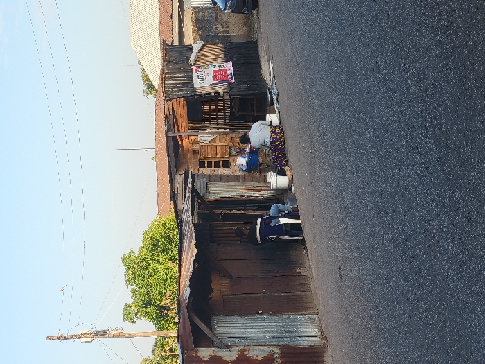 This image captures a daytime street scene in Jos, Nigeria. An asphalt road occupies the foreground, extending into the midground. On the left side of the road, an informal structure constructed from rusted corrugated metal sheets and weathered wooden planks is visible. Seated on a blue and white plastic chair near this structure is an individual wearing a dark top and light blue jeans, facing left with their back partially to the viewer. Adjacent to this, a second, larger informal structure made predominantly of dark wooden planks with a corrugated metal roof is present. Near this structure, another individual, dressed in a light-colored top and a patterned yellow, purple, and white skirt, is seated on the ground or a very low surface, facing left. Several white plastic buckets and a blue plastic basin are arranged near this person. A poster with red and white text, including the word "SHEBAH," is affixed to the right side of the wooden structure. The background features additional buildings with corrugated metal roofs, green trees, and a clear, light blue sky traversed by overhead utility lines. A utility pole is visible on the far left, and a dark-colored vehicle is partially visible on the far right.