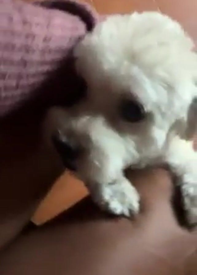 A person sits on the floor, wearing dark shorts and a purple knitted sweater. A small, fluffy, white dog lies across their lap, nuzzling and pawing at the person's leg. The dog appears to be playfully interacting with the person. The floor is made of square tiles.
