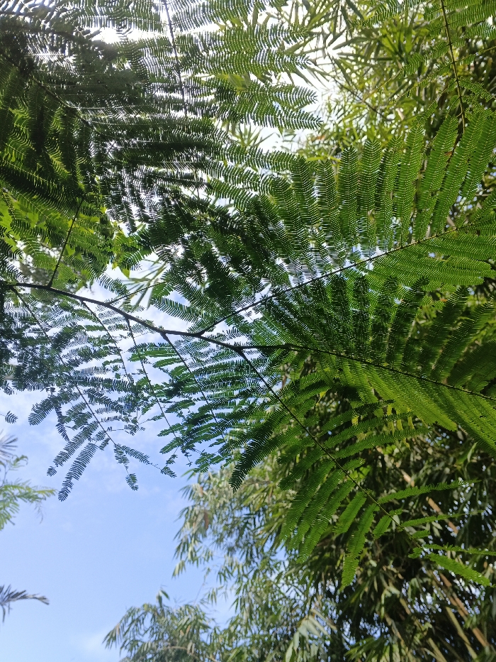 A low-angle shot captures vibrant green tree foliage against a backdrop of a partly cloudy sky. Frond-like leaves with intricate patterns dominate the upper portion, filtering sunlight. Hints of bamboo stems and other greenery fill the lower half of the frame, adding depth and texture to the composition. The perspective emphasizes the lushness and density of the foliage.