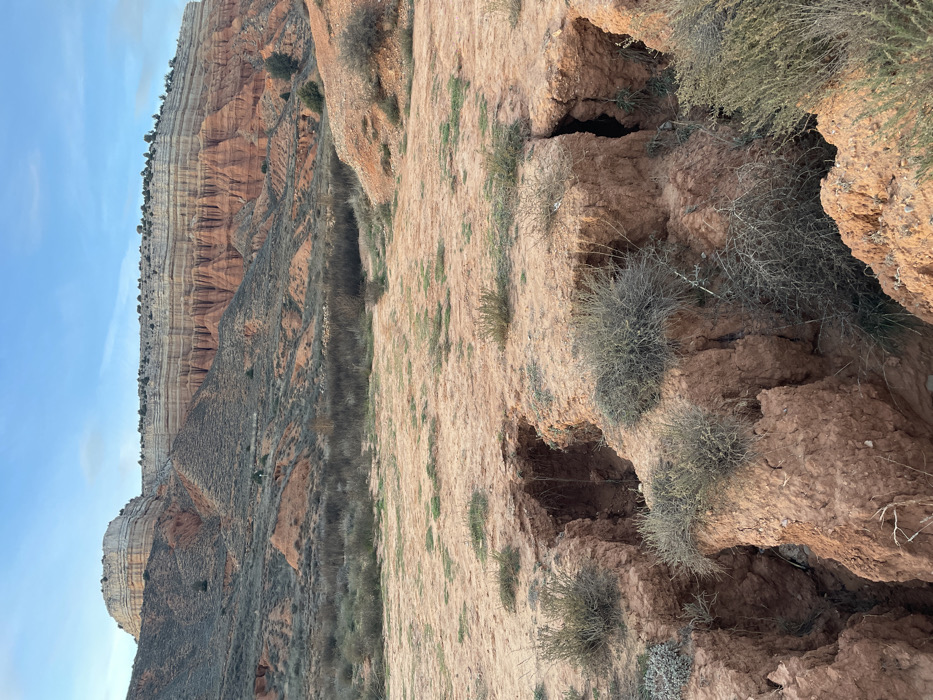 A landscape exhibits layered rock formations with colors ranging from gray and beige to reddish-brown. Sparse vegetation, including dry grass and shrubs, covers the terrain. The foreground reveals eroded cliffs and small caves, while the backdrop showcases a cliff face with horizontal bands of sediment. The sky is partially visible with light blue hues.