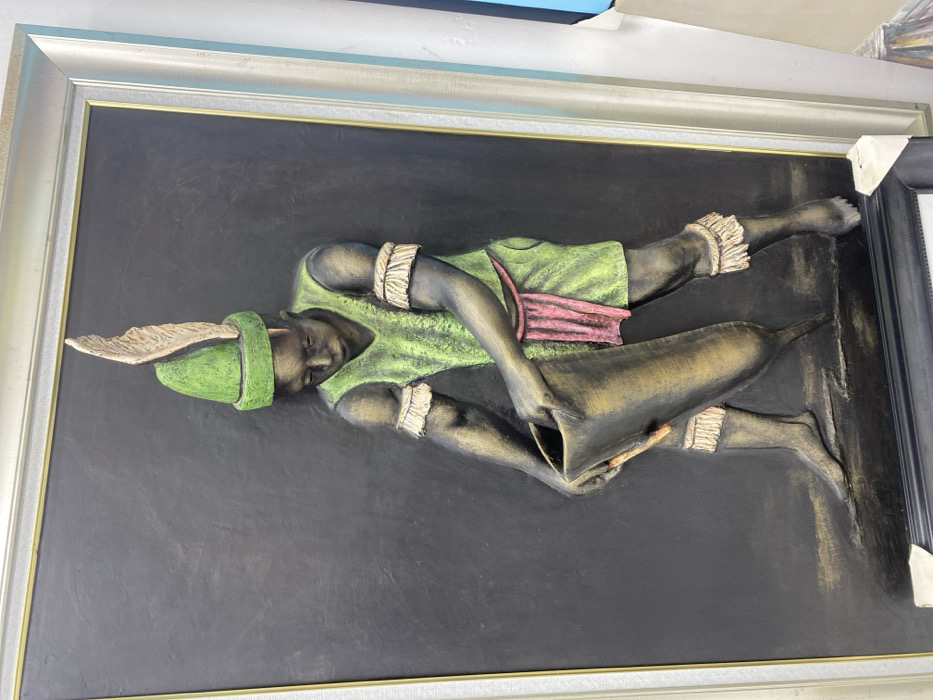 A framed three-dimensional relief artwork, located in Ikate, Nigeria, is depicted