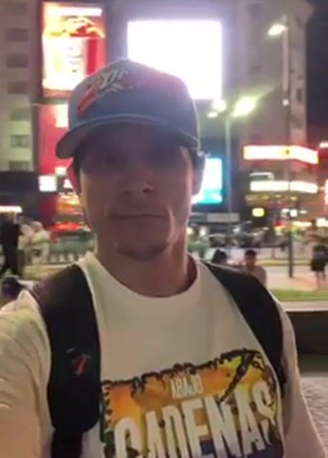 The video features a man recording himself in a brightly lit urban environment at night