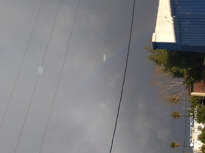 An outdoor scene in Majjate, Morocco, is depicted under a dark, heavily overcast sky. Multiple thin utility lines stretch horizontally across the upper frame against the gray clouds. Two bright, somewhat oval-shaped patches of light are visible in the clouds; the lower patch exhibits subtle rainbow-like coloration on its underside. A thicker, dark cable traverses the mid-frame horizontally. The lower half of the image features a light blue corrugated metal fence or gate on the right, topped by a white structure with jagged, pointed elements. Behind this, a portion of a white building with blue accents is visible. To the left, a grouping of vegetation includes three tall palm trees, a large deciduous tree with bare branches, and several dense evergreen trees. Part of a white, multi-story building with a rounded facade is visible in the distant background on the far left. No individuals or specific actions are depicted. A "REDMI NOTE 8 AI QUAD CAMERA" watermark is present in the lower left corner.