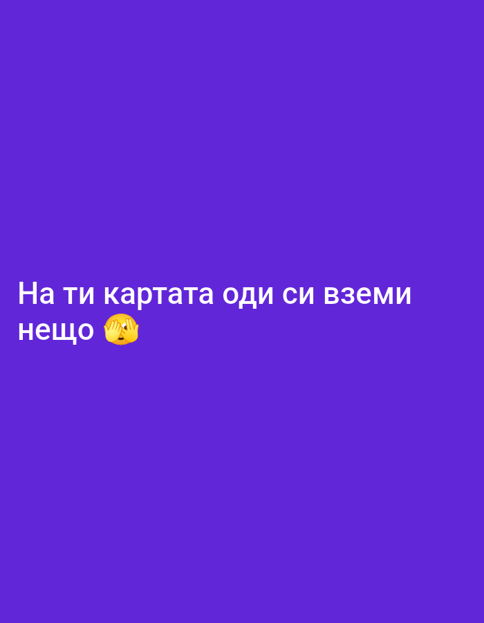 The image is a digital graphic featuring a solid, uniform purple background. White Cyrillic text is centrally positioned in the lower portion of the frame, reading: "На ти картата оди си вземи нещо". This translates to: "Here's the card, go get yourself something." Immediately following the text is a yellow 'face with hand over eyes' emoji (🙈). No individuals, physical objects, or a discernable environment are depicted within the image. The content is purely textual and emblematic; it does not visually represent any specific physical location, including the city of Cherven Bryag, Bulgaria.