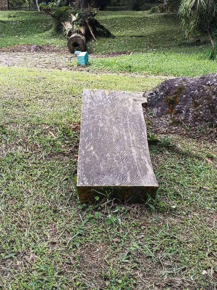The image displays an outdoor scene in La Castellana, Philippines. In the foreground, a rectangular, weathered stone slab, exhibiting grey and dark striations, rests horizontally on uneven green grass. To its immediate right, a large, dark, moss-covered rock is partially visible. The grass around these objects shows varying shades of green, with some brown patches and small plant growth. In the midground, an unpaved pathway, possibly cobblestone, traverses the scene. To the left of this path, a large, fallen tree trunk, appearing partially decomposed with exposed wood and some green vegetation, lies on the ground. A small, bright teal-colored rectangular object is situated near the fallen trunk on the pathway. The background consists of expansive green grassy areas bordered by dense foliage and trees under natural daylight. No people or active interactions are present in the scene.