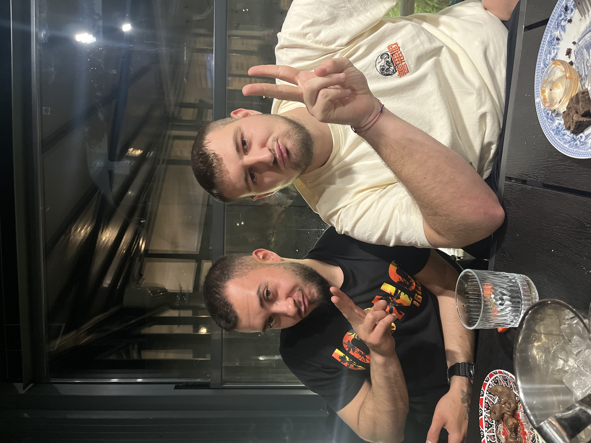 Two adult males are seated at a dark-colored, possibly black, rectangular table in what appears to be a restaurant or similar establishment in Krumovgrad, Bulgaria. The background features large glass panels reflecting interior lights and structural elements. The male on the left has short, dark hair and a beard, wearing a black t-shirt with a faded orange and yellow graphic. His right arm rests on the table, with his hand forming a "peace sign" gesture. A black digital watch is visible on his left wrist. He looks directly at the camera with a slight smirk or pout. The male on the right has short, light brown hair and a beard, wearing an off-white t-shirt with a black and red graphic on the left chest depicting a creature and stylized characters. His left arm rests on the table, with his hand forming a "peace sign" gesture. A red string bracelet is visible on his left wrist. He looks directly at the camera with puckered lips. On the table in front of the left male, there is a red, white, and black patterned plate containing small pieces of cooked dark meat. A stainless steel ice bucket filled with ice cubes is positioned nearby. A clear, ribbed glass containing liquid and ice is also on the table. In front of the right male, a blue and white patterned plate holds a small portion of dark, possibly dessert-like food, with a small, clear, empty glass ramekin and a fork.