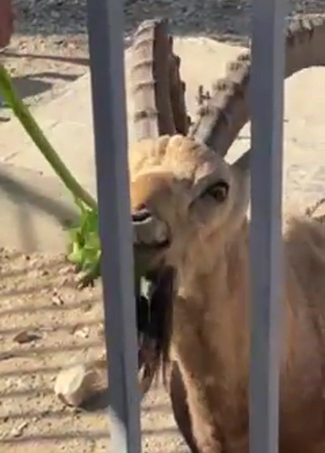 group of Nubian ibexes in a zoo enclosure. One ibex is being fed green vegetables through the bars of the enclosure. It eats the vegetables and walks away. Another ibex is also visible in the enclosure. The enclosure is made of dirt and rocks.