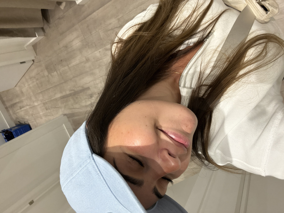 A person in a light blue hooded sweatshirt and a white zip-up jacket poses indoors. Brown hair is scattered across the jacket. The individual's face is visible with eyes closed, showcasing eyebrows, nose, and lips. Part of a white shoe is seen in the upper right corner. Wooden flooring and a staircase can be glimpsed in the background, with a hint of a blue object to the left.