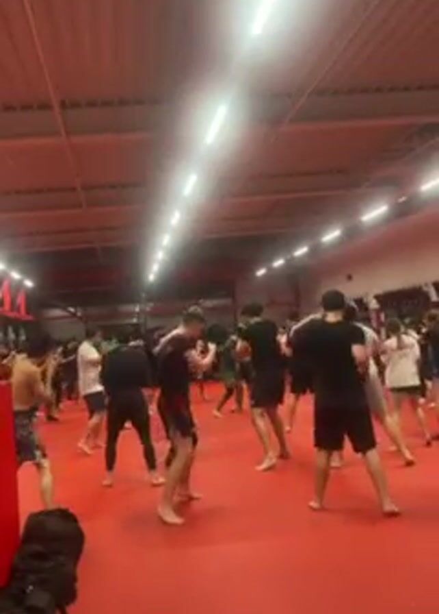 The scene depicts an indoor space, likely a martial arts training gym. A group of around 20 individuals is practicing martial arts maneuvers on a bright red padded floor. The group consists of both men and women, primarily dressed in athletic clothing like shorts, t-shirts, and martial arts-style attire. Some are shirtless, while others wear full-body training suits. The lighting is provided by overhead fluorescent fixtures stretching across the ceiling. A black duffel bag sits on the floor in the lower left corner of the frame. The walls are mostly off-camera but appear to be a neutral color with some red accents, along with martial arts gear hanging in the background.