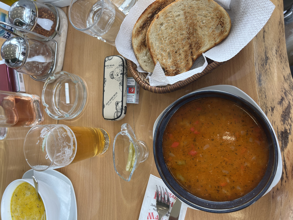 The image depicts a detailed overhead view of a wooden tabletop in a restaurant or cafe setting located in Цигов чарк, Bulgaria. On the left, a white bowl holds a yellowish soup, with a spoon resting within it on a white saucer. Below it, a dark-rimmed bowl contains an orange-red soup with visible diced vegetables, also resting on a white saucer. To the immediate right of the lower soup bowl, a clear glass gravy boat contains several small green pickled items. A white paper napkin with a red logo and a silver fork and knife are positioned to the left of the lower soup bowl. In the upper central area, a clear glass holds an amber liquid, identified as 0.3L of beer with a small head of foam. Behind the beer glass, another clear glass contains a rose-colored liquid. Centrally placed is a clear glass ashtray with a single unlit cigarette. Beneath the ashtray lies a small, beige-colored case patterned with teddy bears and labeled "DIAMOND BEAR," partially obscuring a red and white cigarette pack. On the right side of the table, a wicker basket lined with a white paper napkin holds three slices of toasted bread. Behind the basket, a clear glass of water is visible. In the upper right corner, a stand with two shakers, one containing white spices (likely salt) and the other red chili flakes, is present. A dark-covered book or menu is partially visible behind the rose-colored drink. No individuals are visible in the scene.