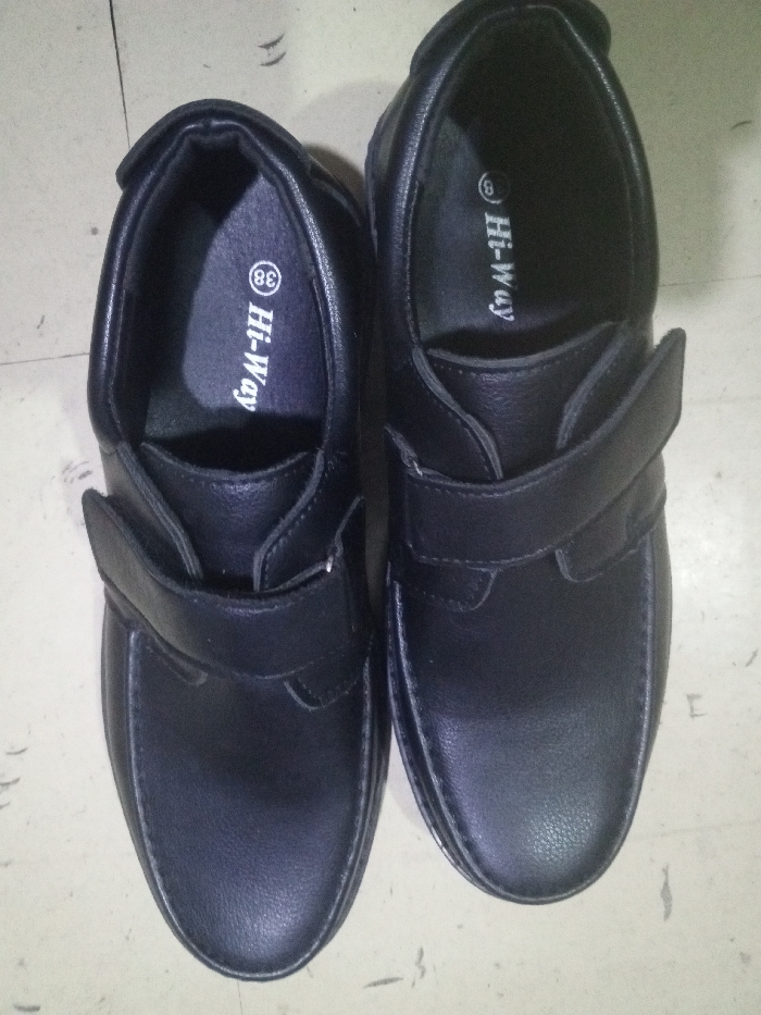 Two black, presumably new, low-cut shoes are positioned side-by-side on a light grey, subtly textured floor surface. Both shoes are constructed from what appears to be synthetic leather or textured leather, featuring two horizontal hook-and-loop (Velcro) straps across the instep for closure. The insoles are visible, displaying the brand "Hi-Way" in white text and a circled number "38," indicating the size. The shoes exhibit defined toe boxes and visible stitching along the soles. No individuals are present, and no actions or interactions are depicted. The scene is located indoors, in the city of Unknown, Unknown.