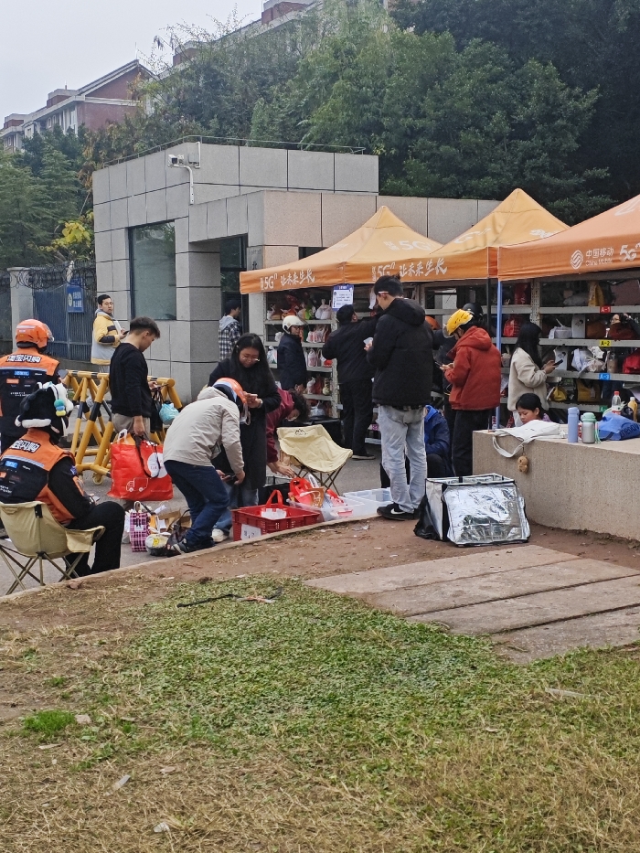 A bustling outdoor scene features a group of people gathered near a building and several orange tents, likely for a promotional event. The tents, labeled with "5G" and Chinese characters, display various items. Delivery personnel in helmets and orange jackets are present, some seated and some handling packages. Other individuals are browsing or interacting with the items on display. A mix of bags, boxes, and containers are scattered around, suggesting an organized distribution or sales event. The surrounding area includes buildings, trees, and a patch of grass.