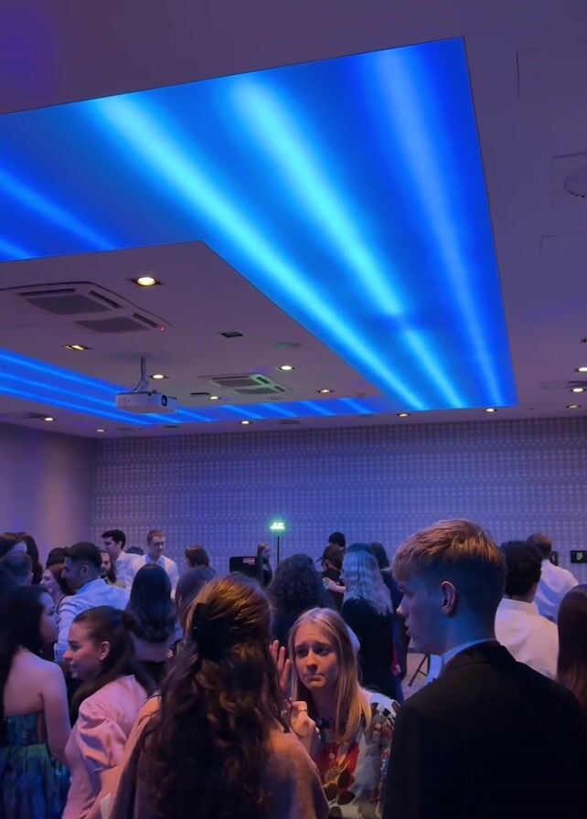 room full of people dancing at a school prom or similar event. The room is illuminated with blue and red lights, and there's a projector hanging from the ceiling. The people are dressed in formal attire, and some are talking to each other while others dance. The wall has a patterned design.