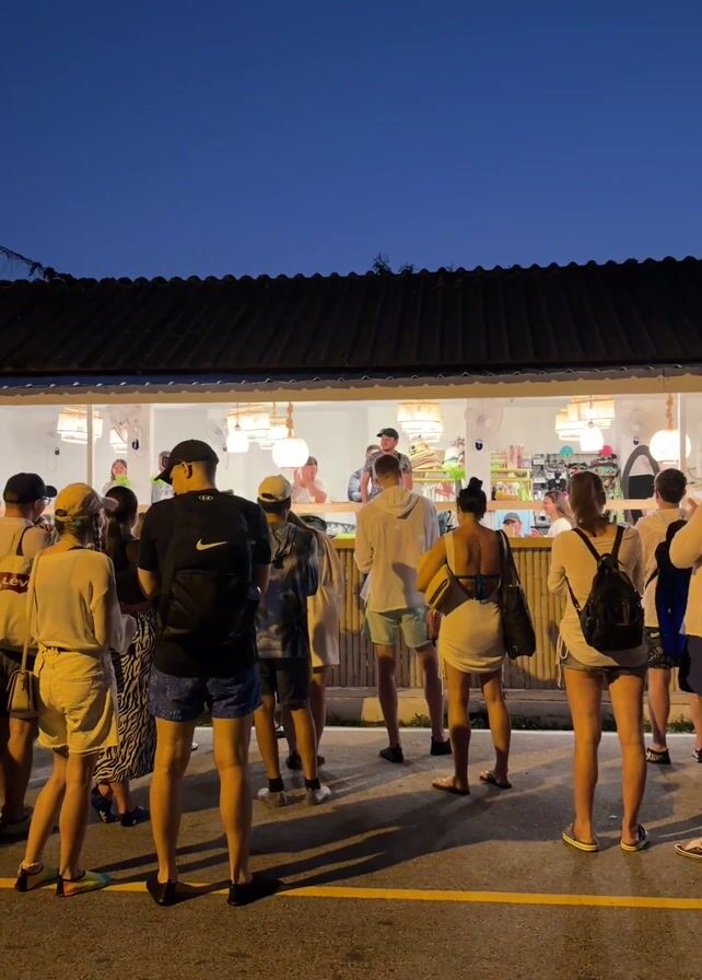 The video depicts a group of approximately 20 people standing in line at an open-air food stand at dusk