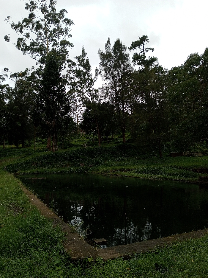 The scene, located in Melakudikadu, India, depicts an outdoor natural environment under an overcast sky. In the foreground, a dark, rectangular pond with concrete edging occupies the lower portion of the frame. The pond's surface reflects the surrounding foliage and sky, appearing still and dark, with a partially submerged dark block visible in the near corner. Dense green grass covers the ground immediately adjacent to the pond and extends into the mid-ground. Beyond the pond, the terrain rises gently, covered in thick green undergrowth and a variety of trees. The mid-ground and background are dominated by a dense arrangement of tall trees with dark green foliage, including slender coniferous types and broader-leafed trees. A light grey, uniformly overcast sky is visible above the tree line. No people, animals, or discernible actions are present. A small, rectangular concrete foundation is visible in the grassy area beyond the pond, to the right of the frame's center.