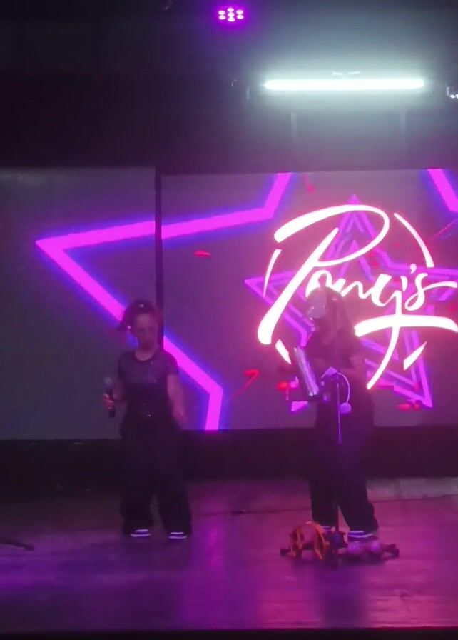 two performers on a brightly lit stage, set against a backdrop of a neon-style sign reading "Tony's." One performer, on the left, has curly hair and is dressed in black. They are holding a microphone and dancing energetically, including a hair flip. The other performer, on the right, is standing next to a piece of equipment. They appear to be setting up or adjusting something, possibly related to music or sound. The stage is lit with purple and white lights, creating a vibrant atmosphere.