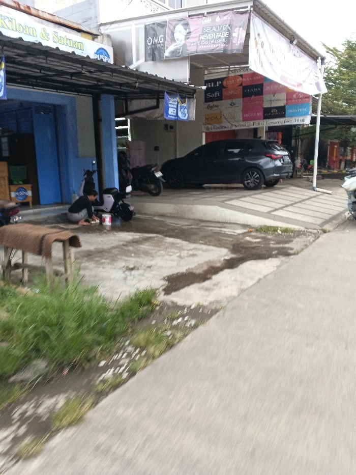 This image captures an urban street scene in Rancamanyar, Indonesia. The foreground displays a paved road on the right, transitioning to a narrower concrete path. To the left of this path, a strip of green grass and damp dirt is visible, along with a partial view of a wooden bench topped with a brown mat. In the midground, a wet concrete surface extends, serving as a driveway or service area. On the left side of this area, in front of a blue-painted storefront, a person is crouched. They wear a dark long-sleeved top and light pants, and appear to be cleaning a light-colored motorcycle or the ground with a white bucket beside them. Behind this activity, another dark motorcycle is parked. The blue storefront features a dark metal awning and signs advertising "Kiloan & Satuan" and "Puspa." To the right, a wider section of the building has white walls, surmounted by a large white awning. This awning supports several advertising banners for cosmetic brands (including OMG, BLP, Safi, Salsabila, YOU, Reglow, Dazzle Me, Skintific), some with Indonesian text like "Selalu On Never Fade Matte Kiss Lip Cream." Beneath this awning, a dark-colored SUV is parked, facing right. A partially visible motorcycle is also present on the far right edge of the frame.