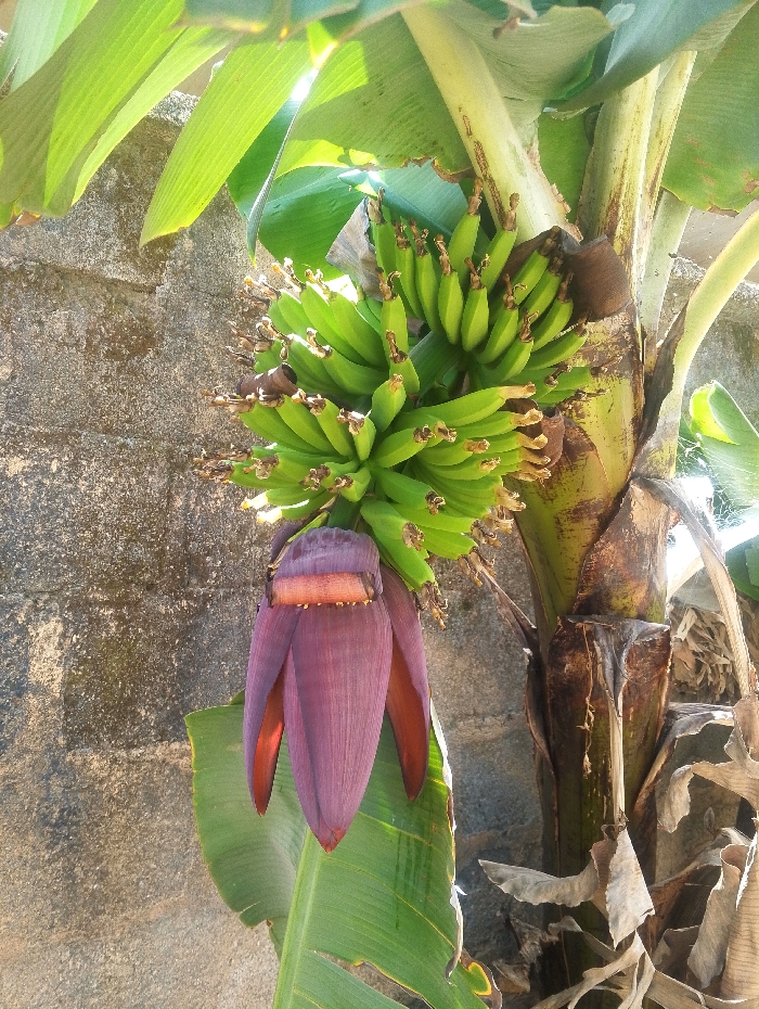 This image, captured in Jos, Nigeria, presents a close-up view of a banana plant (Musa sp.) featuring a developing fruit bunch and its associated blossom. A cluster of approximately 50-70 small, unripe green bananas hangs prominently from the plant's stalk, with individual fruits displaying dried remnants of their perianth at the tips. Directly below this fruit cluster, a large, teardrop-shaped banana blossom, deep purple in color, hangs downwards, revealing lighter, reddish-orange inner bracts. Sections of large, vibrant green banana leaves are visible at the top of the frame and directly behind the blossom. The plant's pseudostem, exhibiting varying shades of green and brown with fibrous texture, is partially visible on the right, alongside some dried, brown leaf material. The background consists of a grey, textured concrete or stone wall, indicating an outdoor setting. The scene is illuminated by natural light, casting bright highlights on the foliage and fruit. No human figures or discernible actions are depicted.