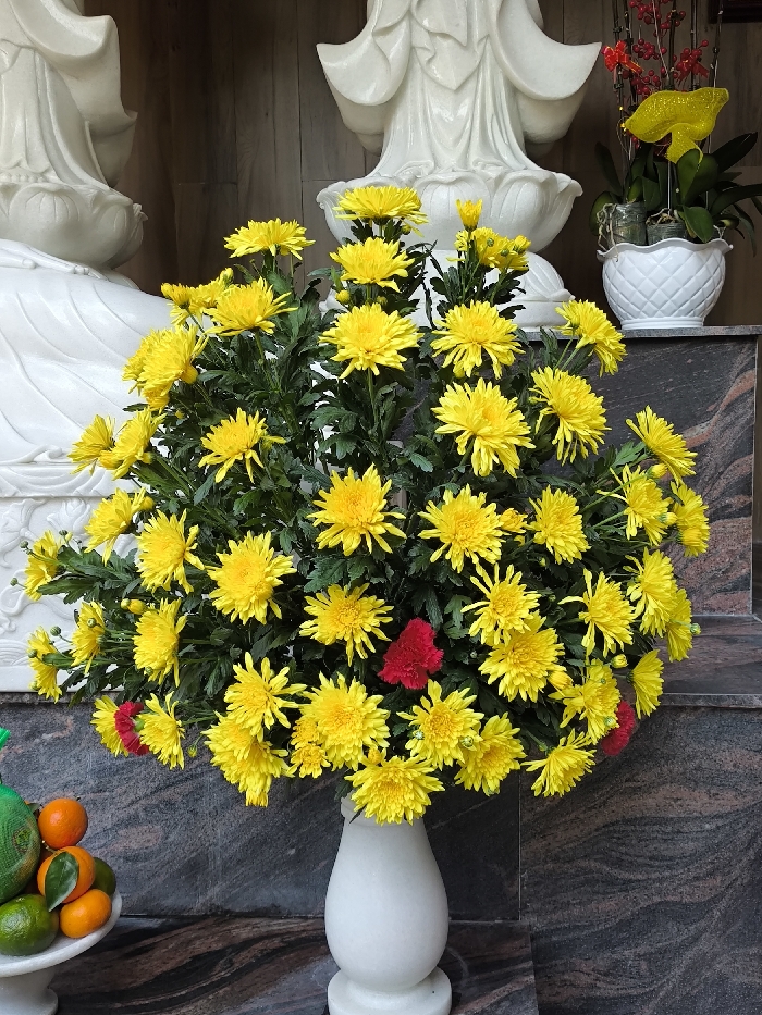 A large, spherical arrangement of vibrant yellow chrysanthemums, interspersed with a few small red flowers, stands prominently in a white, turned marble vase. The vase is positioned on a dark brown, polished granite surface. In the background, the lower sections of two white marble statues, likely depicting Buddhist deities, are partially visible. To the upper right, a white textured pot contains red orchids and a yellow decorative element, also resting on the polished granite. To the lower left, a smaller white marble pedestal holds a green mesh bag containing produce and several loose mandarins and green citrus fruits. The scene depicts a devotional arrangement within what appears to be a religious altar or sacred space in Thành phố Quảng Ngãi, Vietnam.