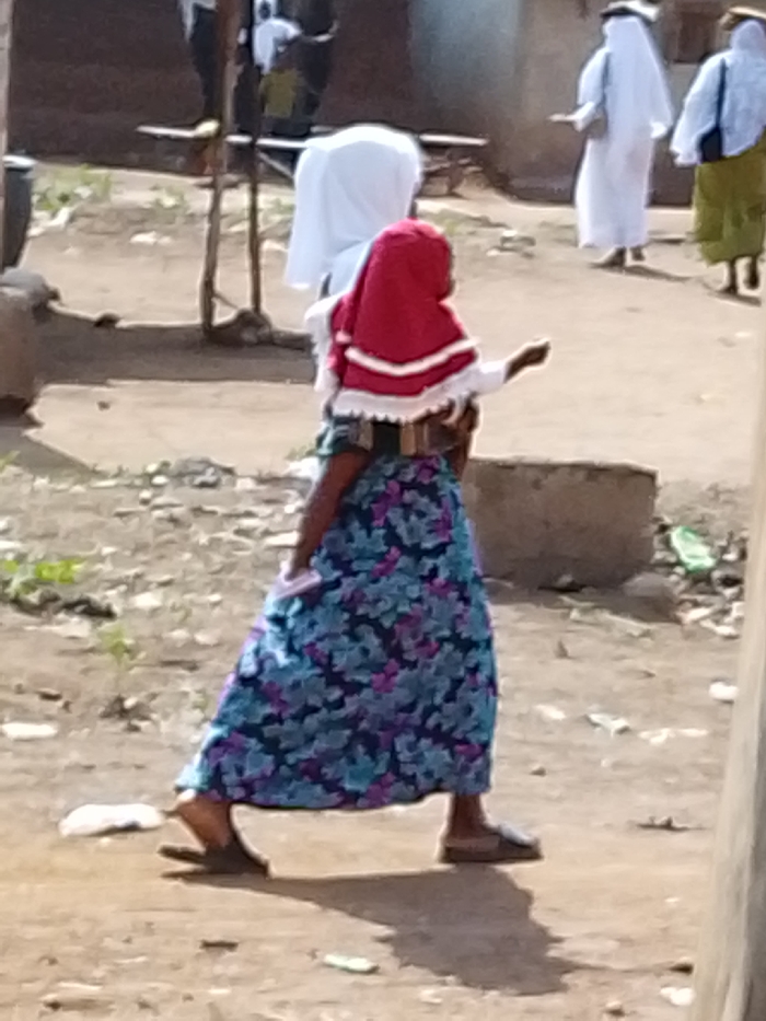 The image depicts an outdoor scene in Oduma Hill, Nigeria, on an unpaved, light brown dirt surface. A female individual, seen from behind and slightly to the right, walks from left to right across the frame. She wears a long, floral patterned dress in shades of blue, teal, and purple, and a red head covering with white trim. A small child, wearing a white head covering, is carried on her back, secured by a brown fabric carrier; the child's left arm is extended outwards. The female wears sandals. In the mid-ground to the right, two individuals walk away from the viewer; both wear long, light-colored garments, with the individual on the far right also wearing a light green lower garment. Blurred brown structures or walls are visible in the background, along with a wooden, two-pronged upright structure in the mid-left background. Sparse green vegetation and small debris are scattered on the ground. Shadows are present, consistent with daylight illumination.