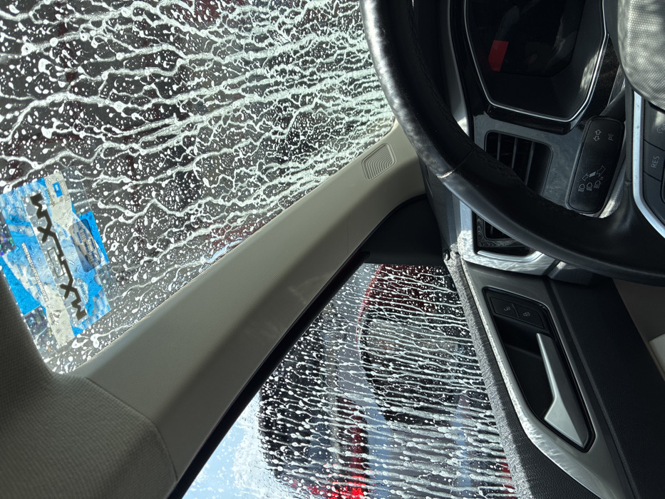 The image depicts the interior perspective from the driver's seat of a vehicle undergoing a car wash